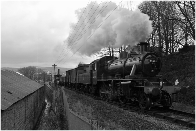 About the last shot I bothered with, the recently-repainted GBRF class 50 which was also visiting. Another example of how I was trying to make the most of the greenery to try and disguise that flat white sky. Soaked through and a bit depressed, I knocked-off after lunch and gave it up as a bad job.